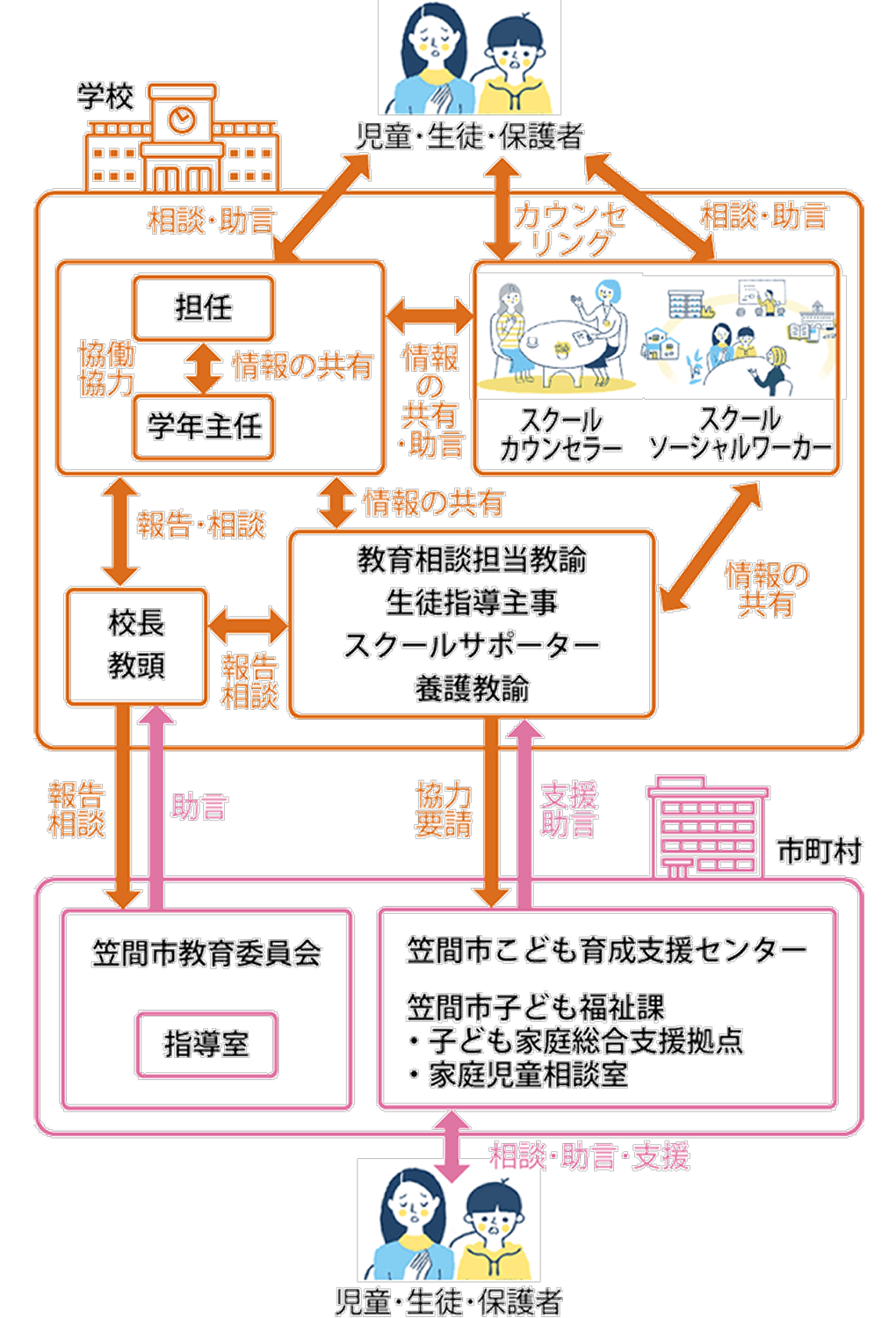 - ピンクの枠(市)のうち、枠内左側、教育委員会は市役所本所とは独立した組織であり、各市町村に必ずあります。笠間市役所本所内、左手奥まったところにあり、相談に行くとしたら「学務課」になります。学務課内の「指導室」には、指導主事が配属されており、学校の監督指導を行っています。学校に関する相談は、指導主事が対応してくれます。相談の際は事前に電話等で予約を取ることをお勧めします。