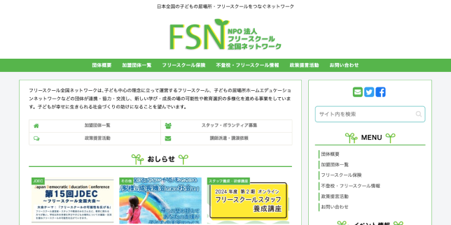 - 全国で約100のフリースクール等がつながる国内最大級のネットワークで、「不登校の子ども」というレッテルで子どもを見るのではなく、子どもたち一人ひとりの個性と自由意思を尊重し「子ども中心の学び」をサポートすることによって、不登校の子ども達の学びと成長を支援する団体です。