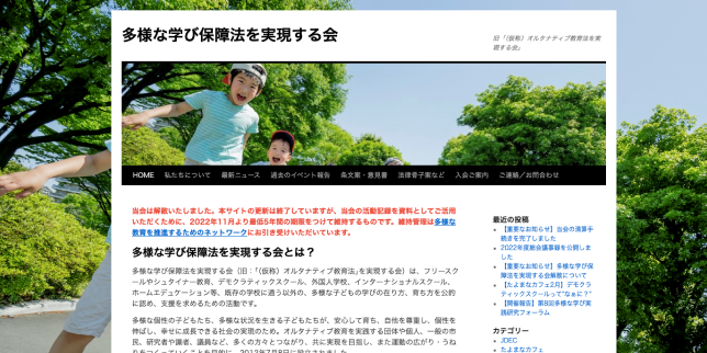 - フリースクールやシュタイナー教育、デモクラティックスクール、外国人学校、インターナショナルスクール、ホームエデュケーション等、既存の学校に通う以外の、多様な子どもの学びの在り方、育ち方を公的に認め、支援を求めるための活動です。