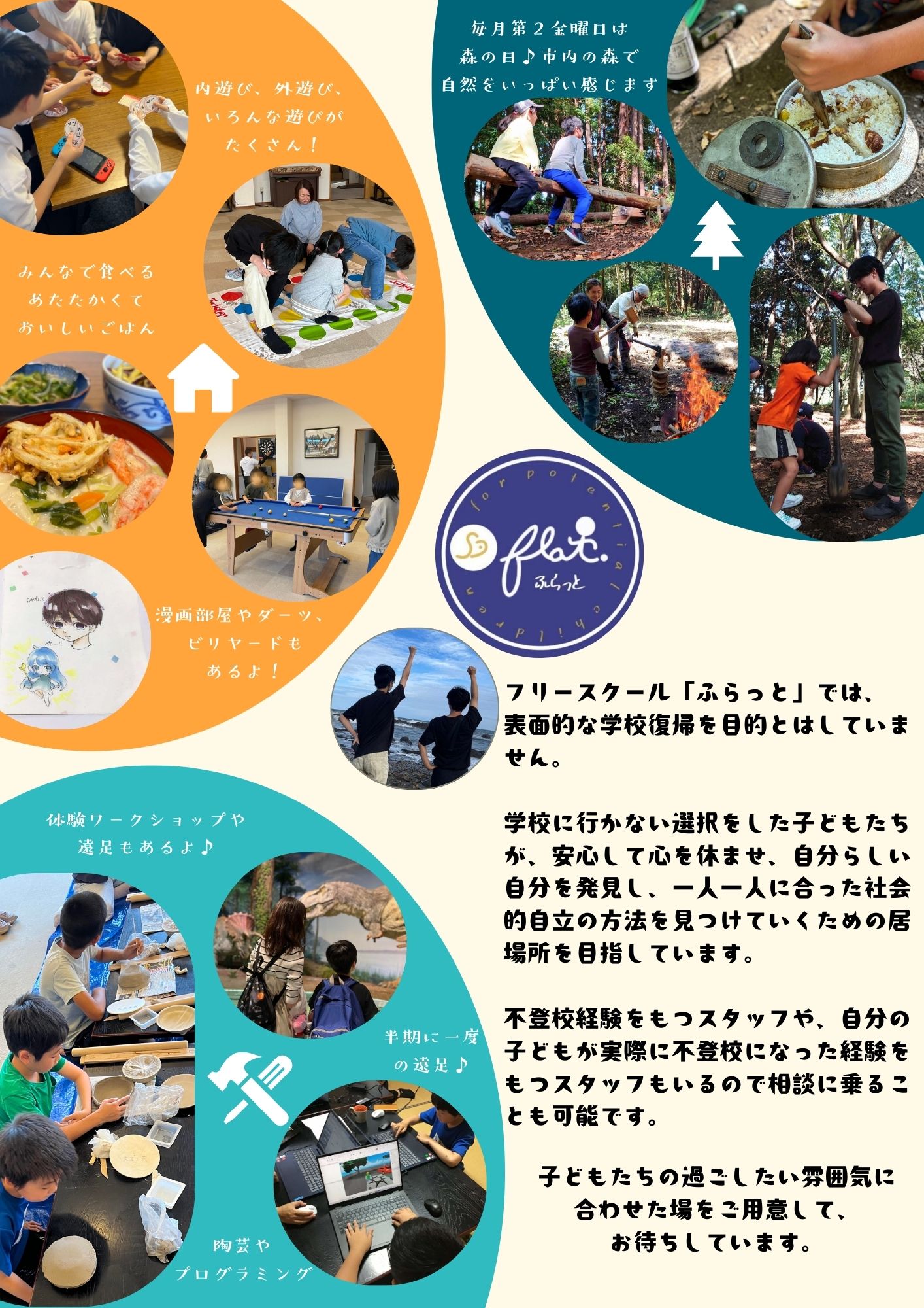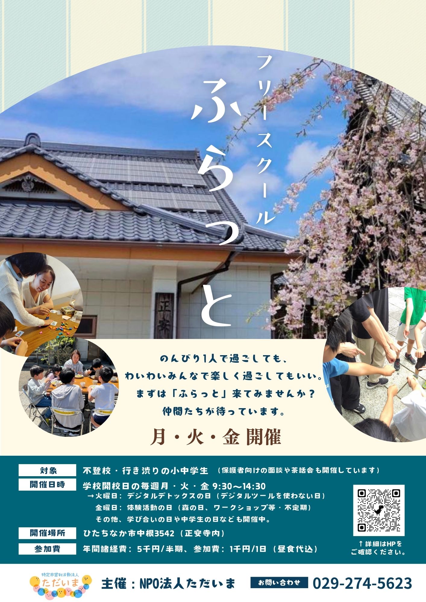 フリースクール「ふらっと」を開いています。学校に足が向かない小中学生の居場所です。